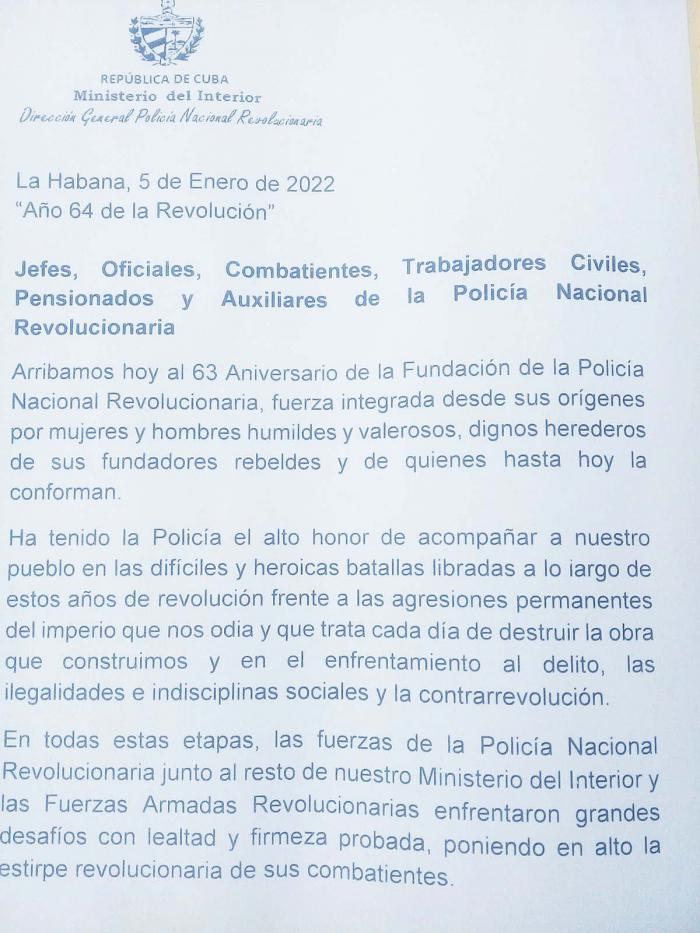 La misiva expresa: "En todas estas etapas, las fuerzas de la Policía Nacional Revolucionaria junto al resto de nuestro Ministerio del Interior y las Fuerzas Armadas Revolucionarias enfrentaron grandes desafíos con lealtad y firmeza probada, poniendo en alto la estirpe revolucionaria de sus combatientes".
