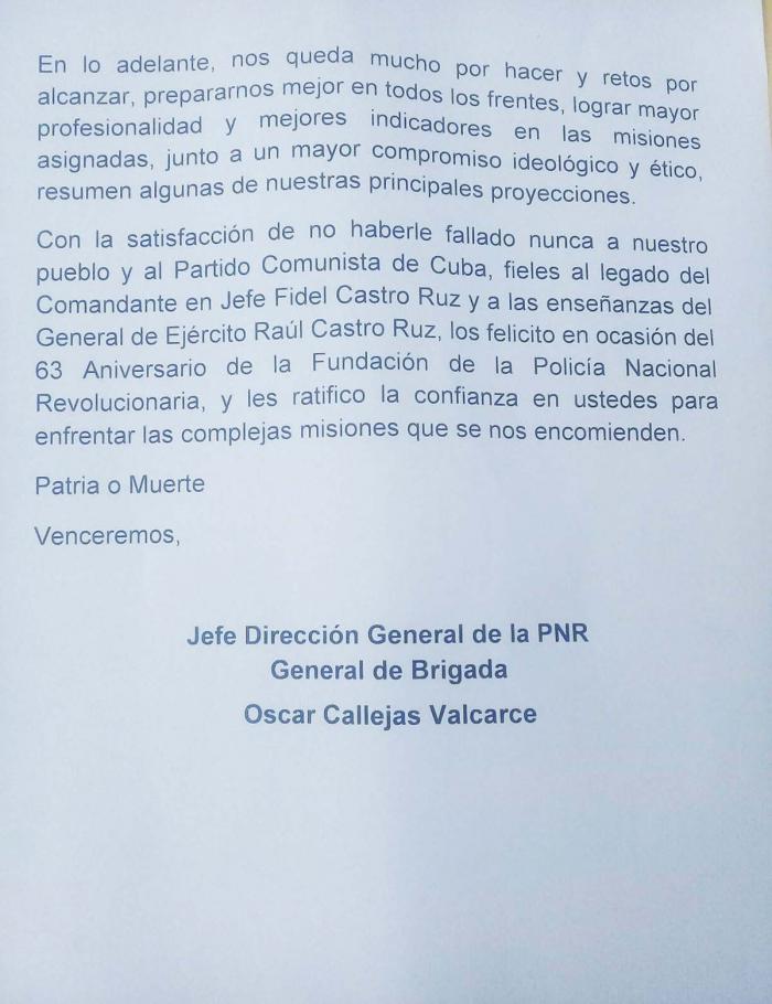 La carta concluye "con la satisfacción de no haberle fallado nunca a nuestro Comandante en Jefe Fidel Castro Ruz y a las enseñanzas del General de Ejército Raúl Castro Ruz; los felicito en ocasión del 63 aniversario de la fundación de la Policía Nacional Revolucionaria, y les ratifico la confianza en ustedes para enfrentar las complejas misiones que se nos recomienden".