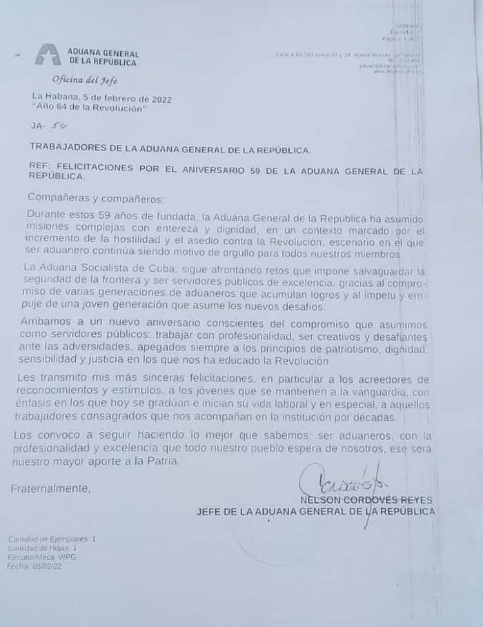 Asistieron a la celebración Norberto Ramos Montero, vicejefe de Departamento del Comité Central del Partido Comunista de Cuba, y Nelson Cordovés Reyes, jefe de la AGR, cuya carta de felicitación enviada a los miembros de la institución fue leída en el acto.