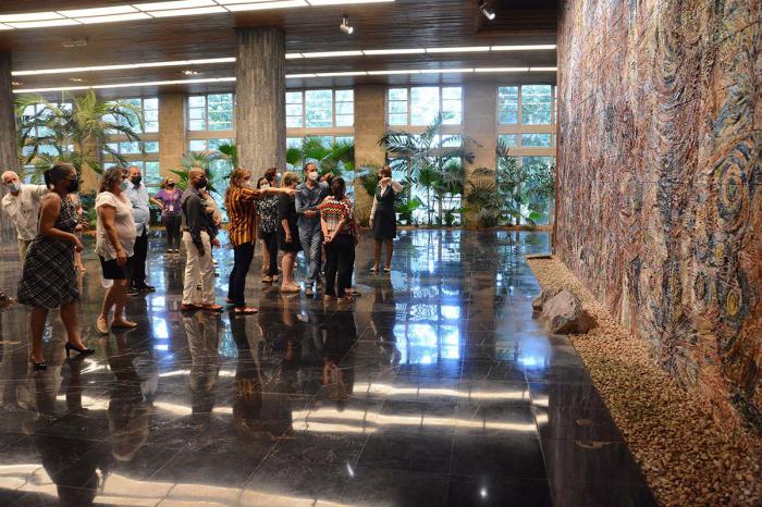 Pero los que lleguen hasta el Palacio de la Revolución podrán acercarse a otras valiosas obras vistas hasta ahora solo en fotografías o por televisión, como el vitral El Sol de América, de Mario Gallardo Muñoz; dos extraordinarias esculturas de Eugenio Rodríguez; o el inmenso mural de cerámica vidriada de René Portocarrero; piezas escogidas por la delicadeza y el buen gusto de Celia Sánchez y ubicadas entre los bien cuidados helechos, evocación perenne de los tiempos de lucha guerrillera en la Sierra Maestra.