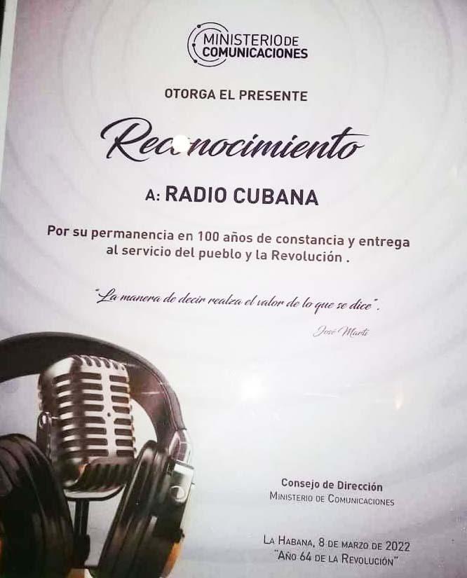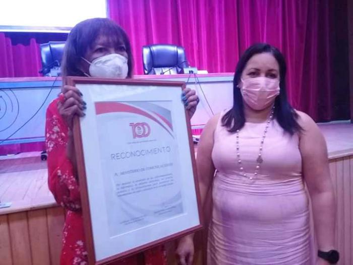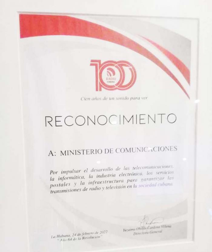 La ocasión fue propicia para que la integrante del Comité Central del Partido Comunista de Cuba y Ministra de Comunicaciones Mayra Arevich Marín entregara a la Radio Cubana un reconocimiento por su centenario, el que fue recibido por Mirta Ramos Difuniao, Directora de Comunicación de la Radio Cubana, quien a su vez entregó un reconocimiento al MINCOM.