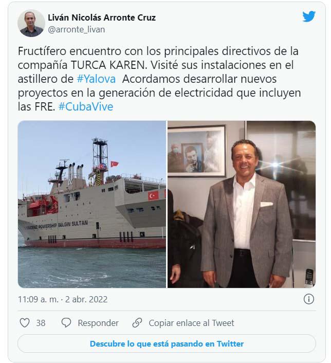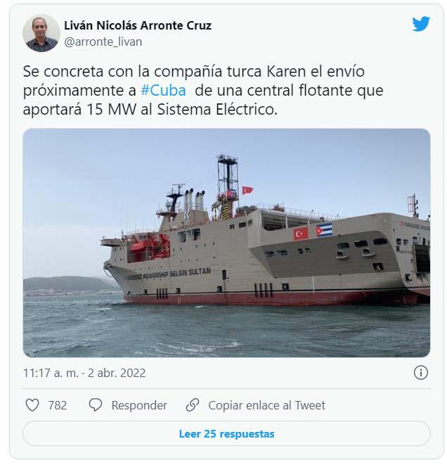 El Gobierno cubano continúa en la búsqueda de alternativas para reforzar la generación de electricidad con la suma de una nueva central flotante, que llegará al país en las próximas semanas procedente de Turquía, informó en su cuenta de Twitter el ministro de Energía y Minas, Liván Arronte Cruz.