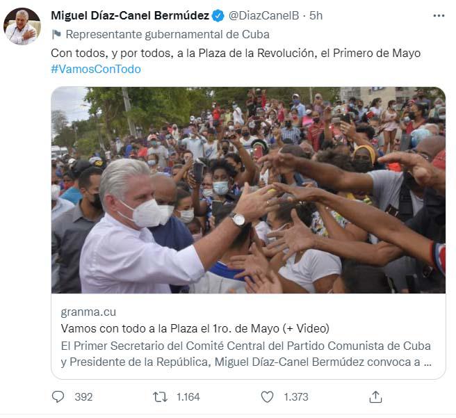 “Con todos, y por todos, a la Plaza de la Revolución, el Primero de Mayo”, escribió el jefe de Estado, y acompañó su mensaje con un enlace a un artículo del diario Granma.
