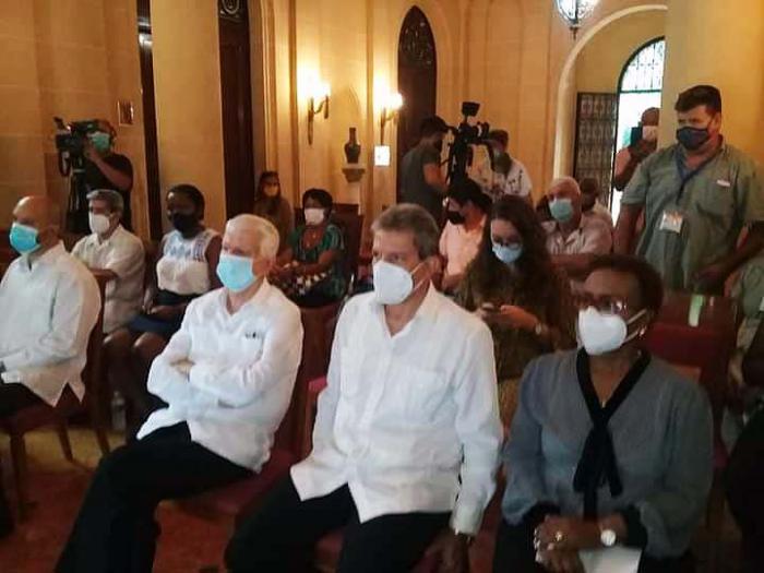Asistieron a la recepción del donativo Víctor Gaute López, vicepresidente del ICAP; Alexander Pellicer Moragas, director de África y Medio Oriente del Ministerio de Relaciones Exteriores; el excelentísimo señor Aklam Salgan, embajador de Palestina en Cuba; y Alfredo Deriche, vicepresidente de la Asociación de Amistad Cubana Árabe.