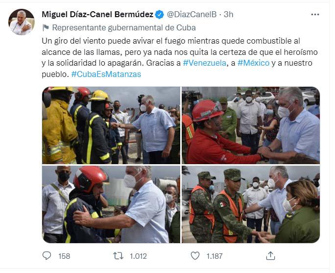 “Gracias a Venezuela, a México y a nuestro pueblo”, escribió el jefe de Estado en la red social y compartió la etiqueta #CubaEsMatanzas.