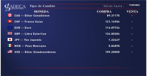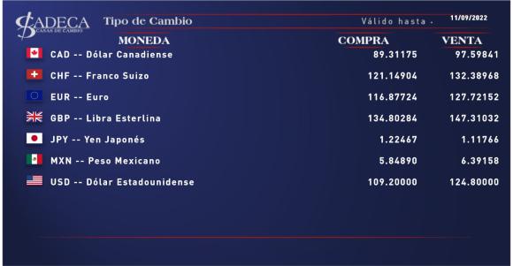 Con el objetivo de mantener informados a los lectores, ofrecemos las tasas de cambio para diferentes divisas extranjeras vigentes este domingo 11 de septiembre en el mercado cambiario del país.