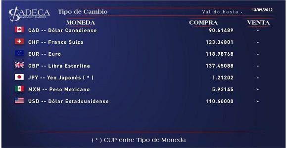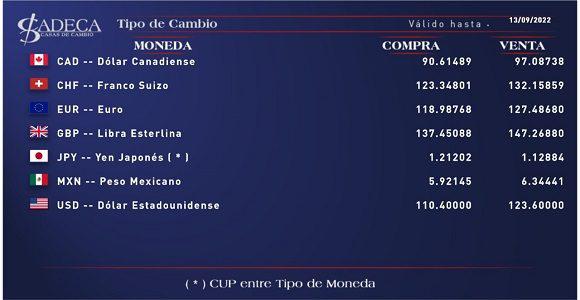 Tasas vigentes en el mercado cambiario cubano este 13 de septiembre