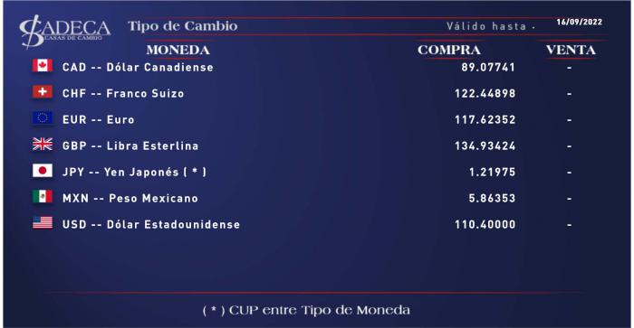 Tasas vigentes en el mercado cambiario cubano este 16 de septiembre