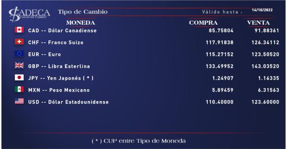 Tasas vigentes en el mercado cambiario cubano este viernes 14 de octubre