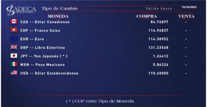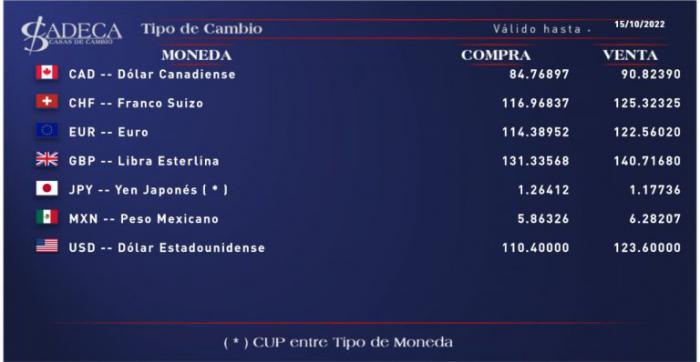 Tasas vigentes en el mercado cambiario cubano este sábado 15 de octubre