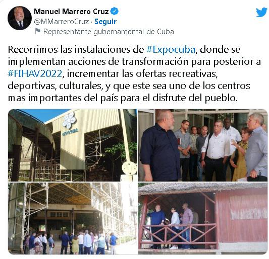 “La Feria Internacional de La Habana #FIHAV2022, constituye la bolsa comercial de carácter general más importante de #Cuba y el Caribe. Chequeamos esta mañana la situación actual de #Expocuba y las acciones de preparación con vistas a este evento”, escribió Marrero Cruz.