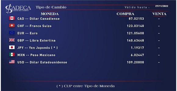 Tasa vigente en el mercado cambiario cubano este domingo 27 de noviembre