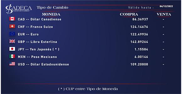 Tasas vigentes en el mercado cambiario cubano este domingo 4 de diciembre
