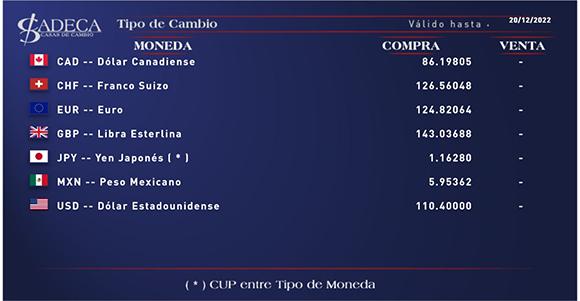Tasas vigentes en el mercado cambiario cubano este martes 20 de diciembre