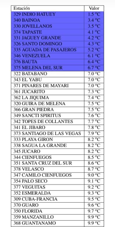 La pasada madrugada fue notablemente fría a lo largo y ancho del país, con 36 reportes por debajo de los 10°C, siendo el valor más bajo el reportado por Indio Hatuey en Matanzas, con 1.5°C de Temperatura Mínima. La temperatura registrada en Guantánamo constituye posible récord absoluto para esa localidad. La información proviene del Instituto de Meteorología de Cuba.