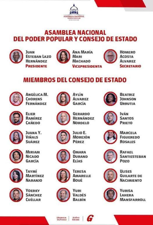 Los otros nuevos miembros del Consejo de Estado son Angélica María Chorens Fernández, directora General Oleohidraúlica de Cienfuegos; Omara Durand Elías, deportista paralímpica y atleta de alto rendimiento; Iván Santos Prieto, presidente de la Asociación Nacional de Economistas y Contadores de Cuba en Villa Clara; Julio Emilio Morejón Pérez, presidente nacional de la Federación Estudiantil Universitaria; y Elier Ramírez Cañedo, subdirector del Centro Fidel Castro Ruz.