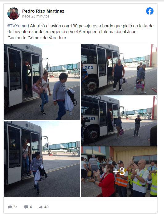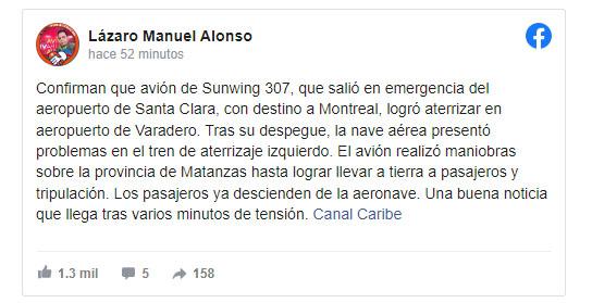 Apuntó que “tras su despegue, la nave aérea presentó problemas en el tren de aterrizaje izquierdo. El avión realizó maniobras sobre la provincia de Matanzas hasta lograr llevar a tierra a pasajeros y tripulación. Los pasajeros ya descienden de la aeronave. Una buena noticia que llega tras varios minutos de tensión”, sostuvo.