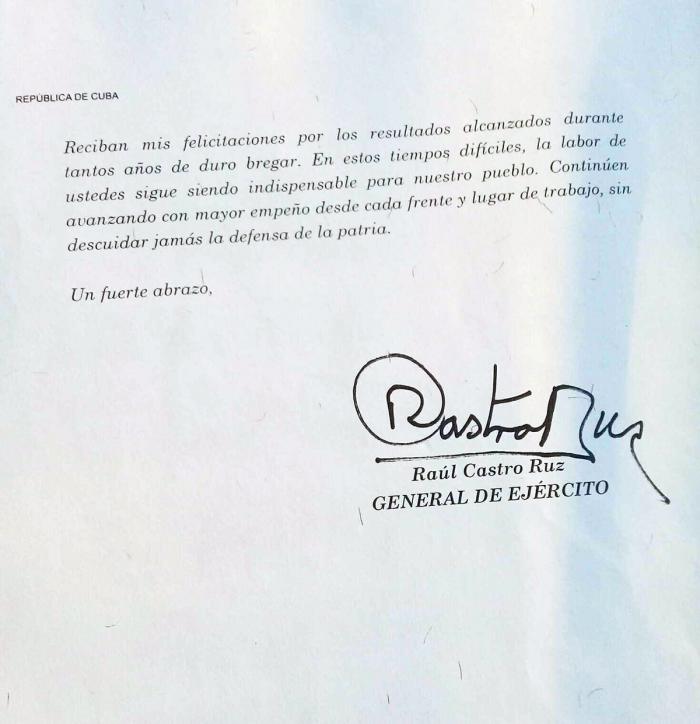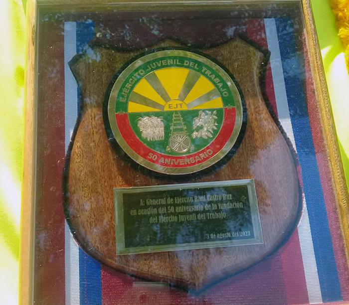 En ocasión del aniversario 50 de la fundación del Ejército Juvenil del Trabajo (EJT), al General de Ejército Raúl Castro Ruz, líder de la Revolución Cubana, se le reconoció con una placa alegórica como fundador de ese mando.
