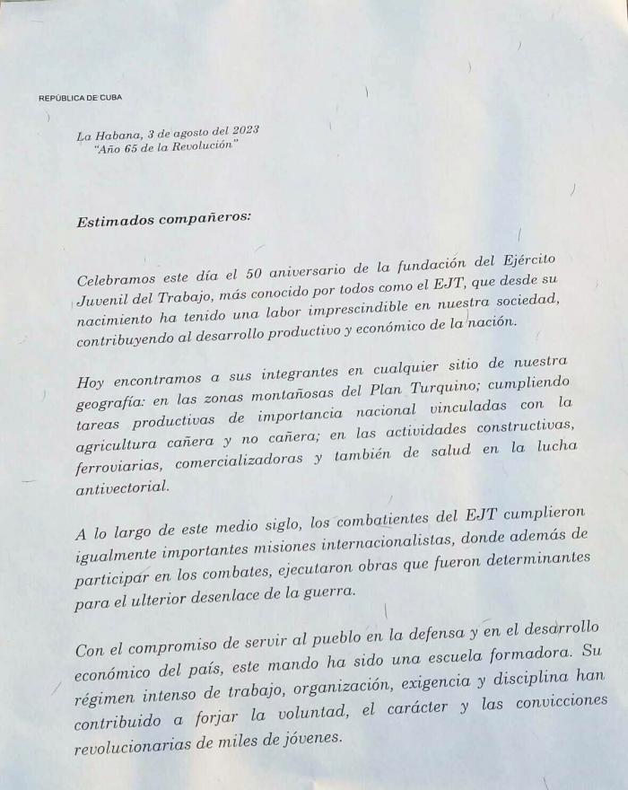 El general de división Víctor Rojo Ramos, jefe de la Dirección Política de las FAR, dio lectura a la carta de felicitación enviada por Raúl al EJT con motivo de su aniversario 50.