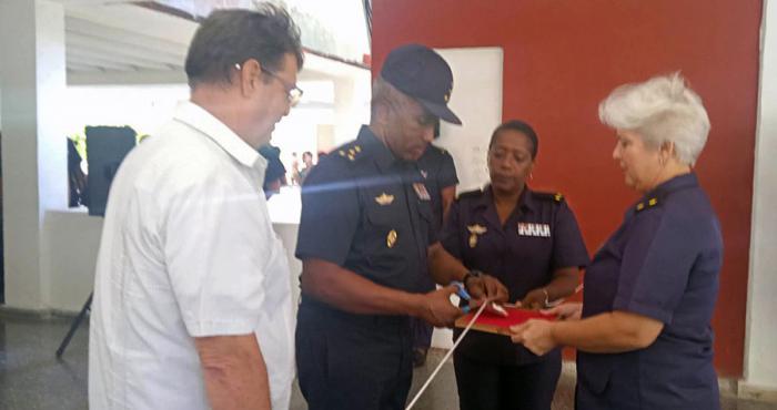 El capitán de flotilla Jorge Martínez Moreno, director de la Academia, y el coronel de la reserva Roque Ernesto Garrigo Andreus, director de la Editorial Verde Olivo, cortaron la driza de la exposición, que forma parte de la jornada de homenaje por el aniversario 97 del natalicio del líder histórico de la Revolución Cubana.