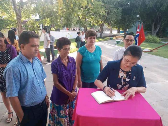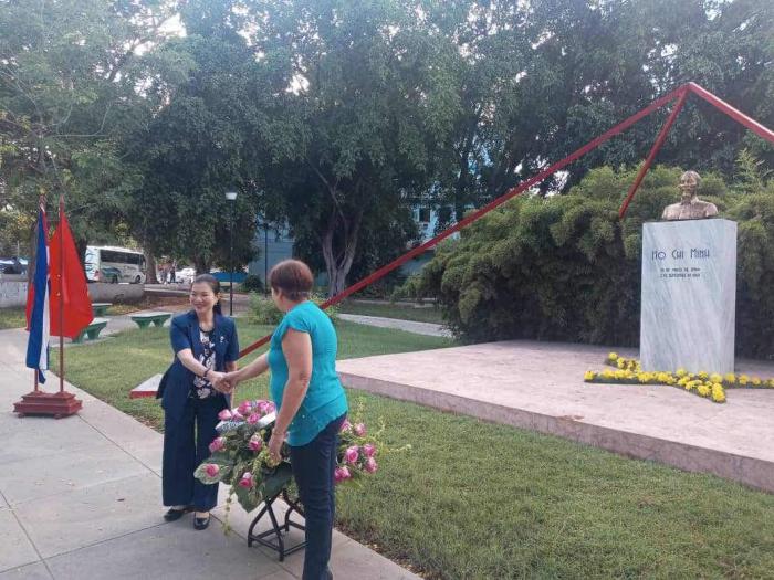 Truong Thi Ngoc Anh, vicepresidenta del Frente de la Patria (FPV) de Vietnam, y la delegación que le acompaña, rindieron este domingo en La Habana, homenaje al líder del pueblo vietnamita Ho Chi Minh, en el parque donde se erige un busto del guía histórico de la independencia del país indochino, en el municipio capitalino de Plaza de la Revolución.