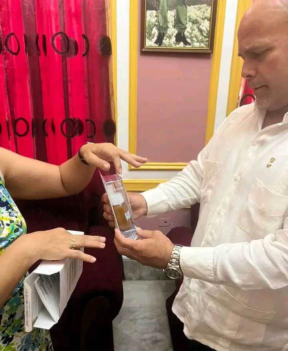 El Héroe de la República de Cuba, Gerardo Hernández Nordelo, Coordinador Nacional de los CDR, recibió la donación de cemento quirúrgico. Foto: Maya Cuba