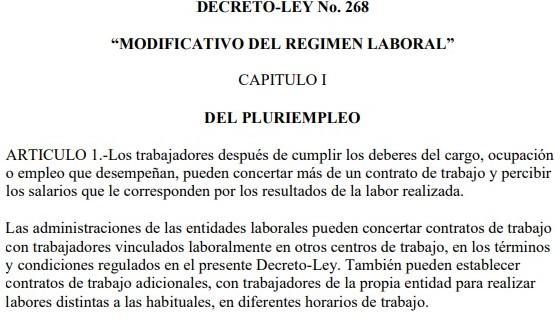 El periódico Trabajadores destaca lo estipulado en el ARTÍCULO 1 del Decreto Ley 268. El texto especifica: