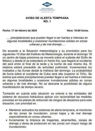 El Instituto Nacional de Recursos Hidráulicos emitió, la víspera, el Aviso de Alerta Temprana No. 1, debido a precipitaciones que pueden llegar a ser fuertes e intensas en algunas localidades y ocasionar inundaciones súbitas en zonas urbanas y de mal drenaje.