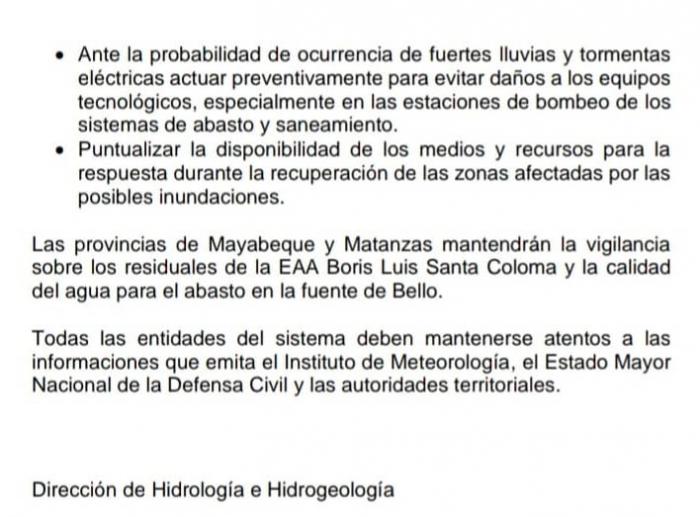 Todas las entidades del sistema deben mantenerse atentos a las informaciones que emita el Instituto de Meteorología, el Estado Mayor Nacional de la Defensa Civil y las autoridades territoriales.