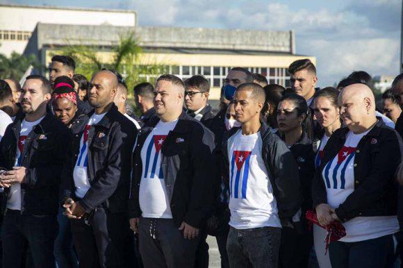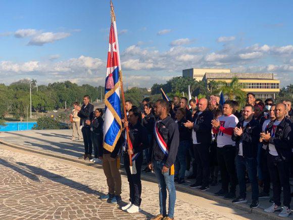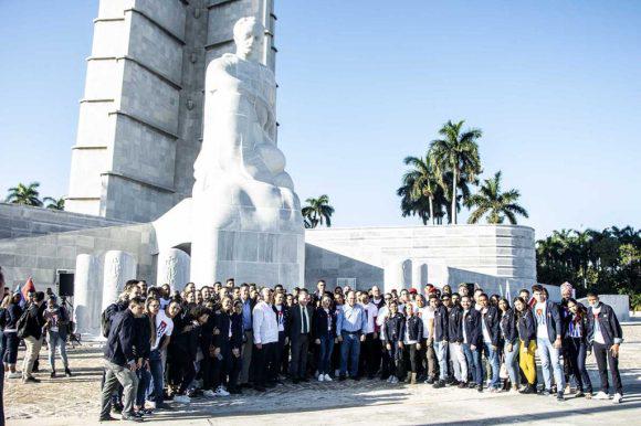 Minutos antes del abanderamiento, una ofrenda floral fue colocada al pie del monumento a José Martí. Acompañando a los jóvenes estuvieron, asimismo, en el acto de abanderamiento, el miembro del Buró Político Bruno Rodríguez Parrilla, ministro de Relaciones Exteriores, y el Excelentísimo Señor Embajador de la Federación de Rusia, Víctor Koronelli.