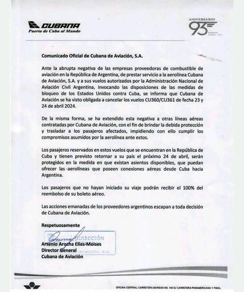 Cubana de Aviación debió cancelar dos vuelos, correspondientes a este 23 y 24 de abril, a Argentina ante la negativa de la empresa proveedora de combustible de ese país de prestarle servicio, invocando las disposiciones del bloqueo contra la Isla.