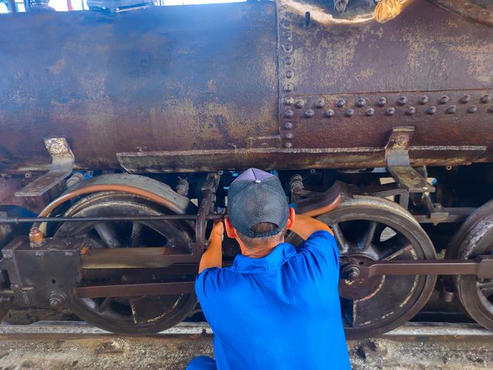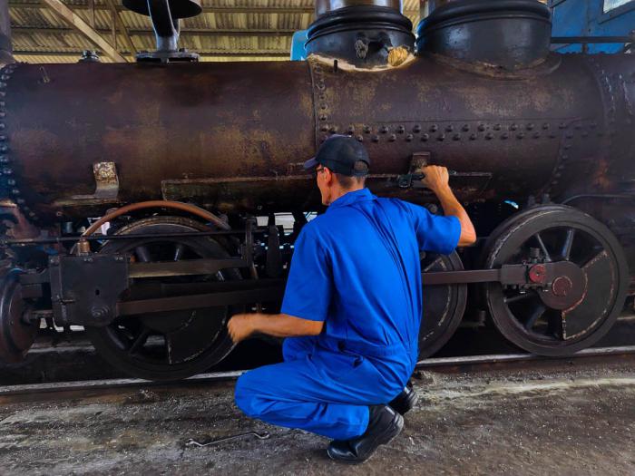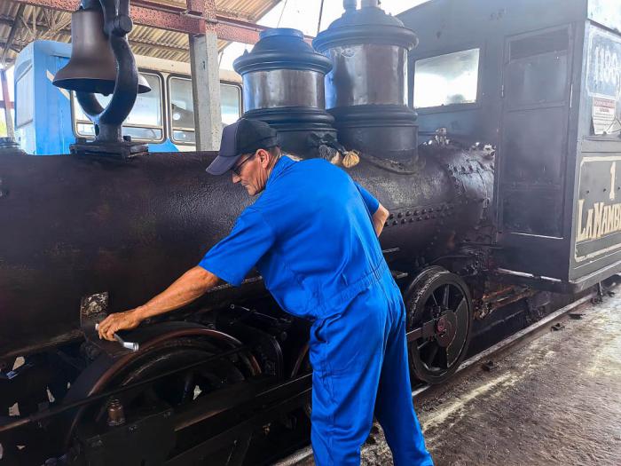 La Mambisita es historia andante, la más antigua que tiene el ferrocarril cubano, 142 años de explotación, le dicen así de cariño, y su mecánico, Antonio, la repara con tanto afecto que parece que le ruega.