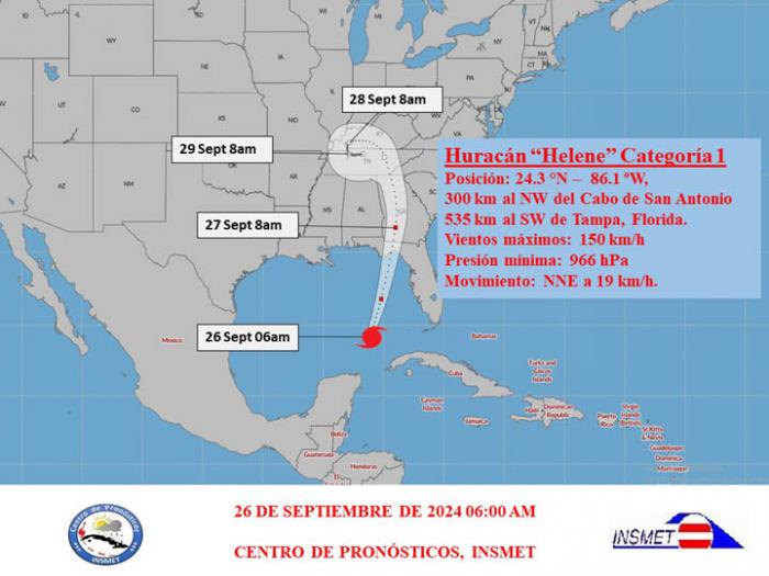 La amplia circulación de Helene ha generado vientos sostenidos durante la madrugada de 60 kilómetros por horas en la estación meteorológica de Casablanca, La Habana. Además, se reportaron varias rachas fuertes, con 101 kilómetros por horas en Santa Lucía, Pinar del Río; 92 kilómetros por horas en Casablanca, La Habana y 70 kilómetros por horas en la estación de la ciudad de Cienfuegos. El huracán continuará desplazándose por el este del Golfo de México, manteniendo similar trayectoria e incrementando su velocidad de traslación y ganando en intensidad.