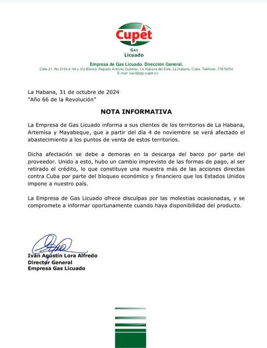 La Empresa de Gas Licuado informa a sus clientes de los territorios de La Habana, Artemisa y Mayabeque que a partir del día 4 de noviembre se verá afectado el abastecimiento a los puntos de venta de estos territorios.