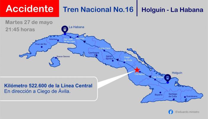 El ministro del Transporte, Eduardo Rodríguez Dávila, informó que a las 9:45 de la noche de ayer, 27 de mayo de 2025, el Tren Extra 16, al servicio de la transportación nacional de pasajeros con la ruta Holguín-La Habana, sufrió un descarrilamiento en el kilómetro 522.600 de la Línea Central, en dirección a Ciego de Ávila, en el punto conocido como acceso comercial El Cárnico, provincia Camagüey.