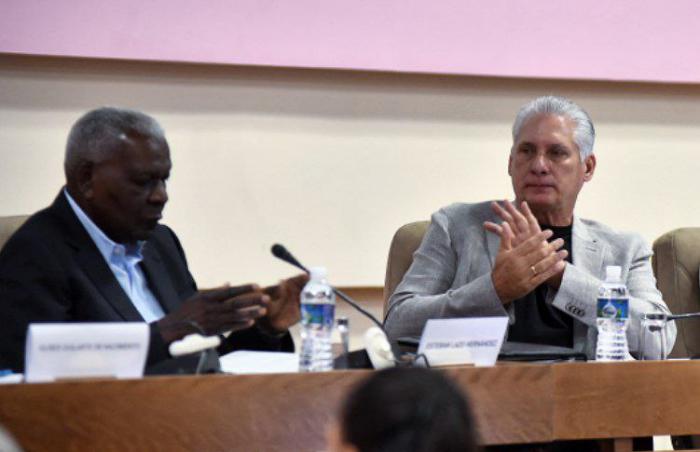 Junto al mandatario cubano en el Palacio de Convenciones de La Habana se encontraban los miembros del Buró Político Esteban Lazo, presidente de la Asamblea Nacional del Poder Popular, y Roberto Morales Ojeda, secretario de Organización del Comité Central, y Ulises Guilarte, secretario general de la Central de Trabajadores de Cuba.