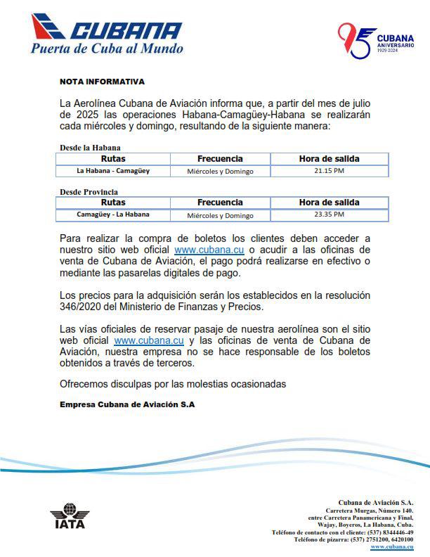 Cubana de Aviación informa a sus clientes que a partir del mes de julio las operaciones Habana-Camagüey-Habana, comenzarán a realizarse cada miércoles y domingo.