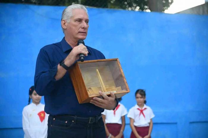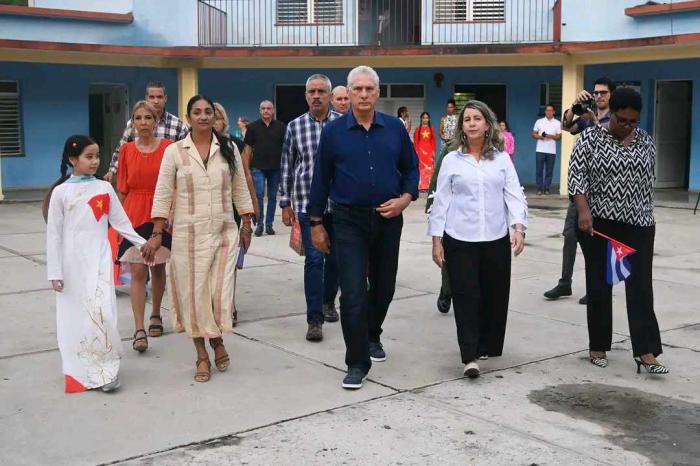 El Primer secretario del Comite Central del Partido Comunista de Cuba y Presidente de la Republica, Miguel Díaz-Canel Bermúdez, visitó este lunes la escuela «Vo Thin Thang», enclavada en el capitalino municipio de Playa, donde entregó un regalo consistente en réplicas de sitios visitados en Vietnam cuando encabezó la delegación cubana por la celebración del aniversario 80 de la Proclamación de la Independencia de la hermana nación.