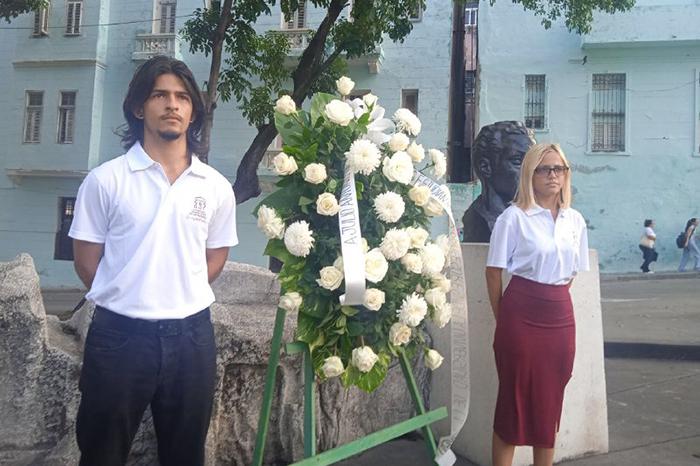 En acto previo, miembros de la FEU, de la Federación de Estudiantes de la Enseñanza Media (FEEM) y de la Unión de Jóvenes Comunistas (UJC) depositaron una ofrenda floral ante el monumento que guarda las cenizas del líder estudiantil Julio Antonio Mella (1903-1929), sitio donde reflexionaron en las complejidades y responsabilidad que implica ser jóvenes en la Cuba de hoy.