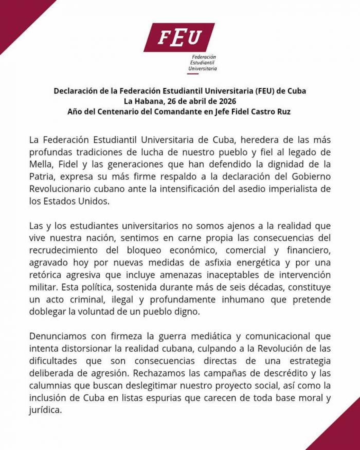En la declaracion la FEU denuncia el recrudecimiento del bloqueo económico, comercial y financiero que por más de 65 años mantiene el gobierno de los Estados Unidos contra la la Mayor de las Antillas,ahora agravado con un cerco energético y las amenazas de una agresion militar.
