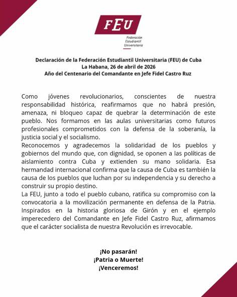 En el contexto del centenario del Comandante en Jefe Fidel Castro Ruz, la organizacion estudiantil patentizó su responsabilidad histórica en las aulas universitarias e indicó que «no habrá presión, amenaza, ni bloqueo capaz de quebrar la determinación de este pueblo». Asimismo, la declaración define la formación de los futuros profesionales como un compromiso con la defensa de la soberanía y la justicia social.