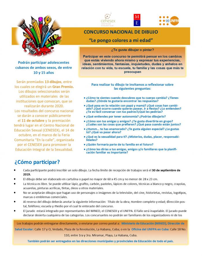 Muchachas y muchachos de entre 10 y 15 años, de nacionalidad cubana y residentes en el país, tienen hasta el 30 de septiembre para enviar obras al concurso de dibujo Le pongo colores a mi edad, que convocan el Centro Nacional de Educación Sexual (CENESEX), el Ministerio de Educación (MINED) y la oficina en Cuba del Fondo de Población de las Naciones Unidas (UNFPA),