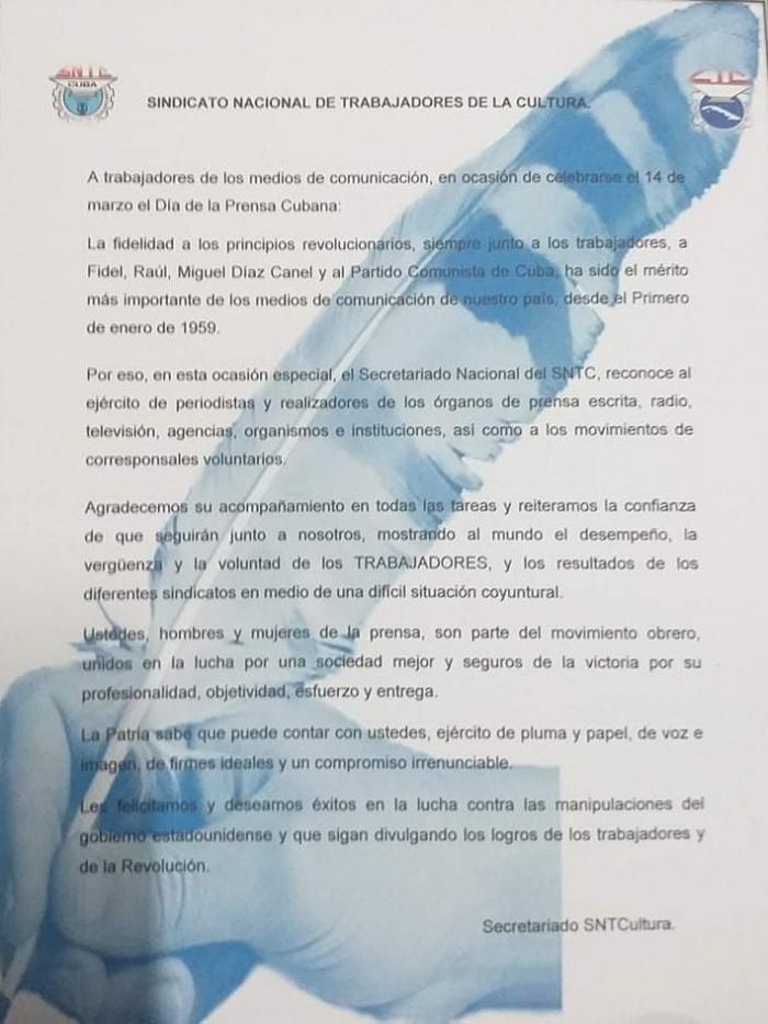 La carta de felicitación a los profesionales de la Prensa se dio a conocer durante el acto, la cual en un fragmento destaca: "La fidelidad a los principios revolucionarios, siempre junto a los trabajadores, a Fidel, Raúl, Miguel Díaz-Canel y al Partido Comunista de Cuba, ha sido el mérito más importante de los medios de comunicación de nuestro país, desde el Primero de enero de 1959".