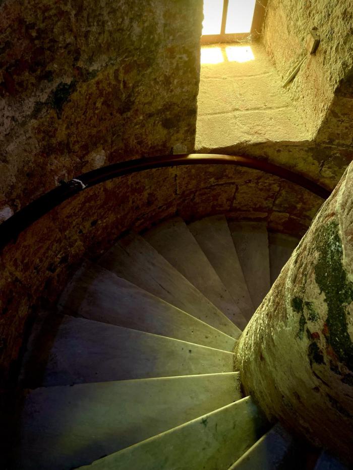 Al interior de la torre, la estrecha escalera de piedra y el último tramo de madera indican el camino hacia la cima del Faro. Foto: Marian Eugenia Serrano Estepa