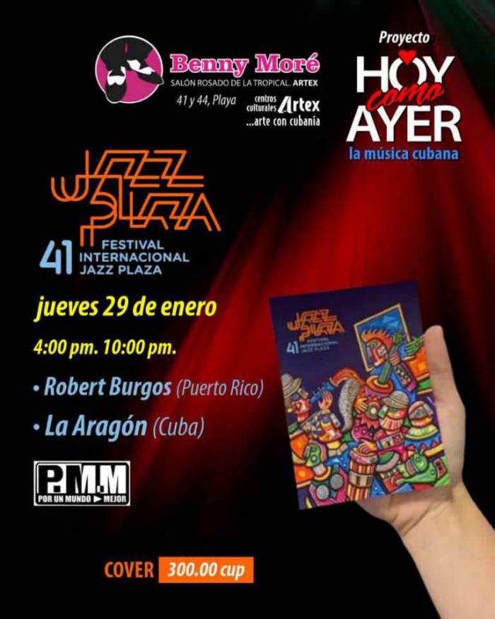 Como parte de las propuestas de la 41 edición del Festival Internacional Jazz Plaza 2026, el Salón Rosado de La Tropical Benny Moré se viste de largo, cuando hoy jueves 29, suban al escenario dos agrupaciones emblemáticas de la música caribeña: la Orquesta Aragón de Cuba y la orquesta dirigida por Robert Burgos, de Puerto Rico.