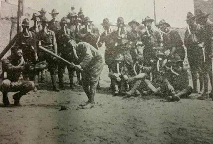 Una de las imágenes que llegó a la actualidad muestra a un grupo de soldados asumiendo medidas de prevención durante un juego escenificado también en el año 1918, en medio de la Primera Guerra Mundial.