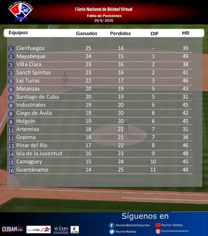 La cima está en poder de Cienfuegos (25-14), ya prácticamente asegurado para la gran final, mientras que cercanos a certificar su pasaje a la ronda de los ocho mejores están Mayabeque (24-15), Villa Clara (23-16) y Sancti Spíritus (23-16), quienes completan el cuarteto de vanguardia.