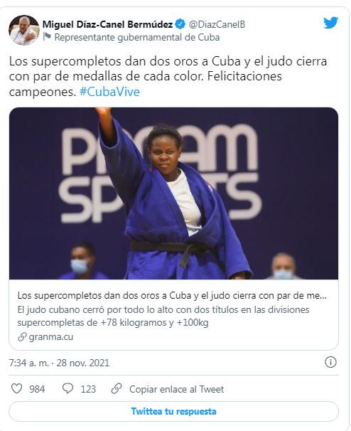 Los supercompletos dan dos oros a Cuba y el judo cierra con par de medallas de cada color. Felicitaciones campeones. #CubaVive, escribió el mandatario en su cuenta oficial en Twitter.