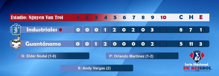 Elder Nodal logró detener a los anfitriones durante dos entradas y eso le valió para anotarse el triunfo, y se fue a la cueva dejando el rancho ardiendo con dos corredores en las almohadas sin outs en la parte baja del séptimo, pero el paño de las lágrimas azules, Andy Vargas, ponchó a tres contrarios y bajó hasta los tobillos las esperanzas orientales.