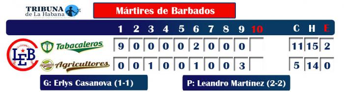 En el Mártires de Barbados de Bayamo, los visitantes Tabacaleros no respetaron líderes ni localías y con un paquete humeante de nueve carreras en el mismo capítulo de apertura derrotaron a Agricultores 11-5.